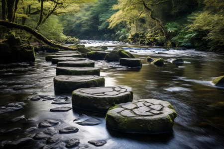 stepping stones across a clear, shallow stream, created with generative ai