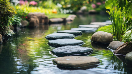 Immerse yourself in a serene garden scene featuring a tranquil path of stepping stones over calm water, surrounded by lush greenery and colorful flowers.