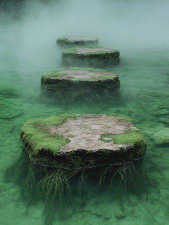 Mystical stepping stones in misty green waters