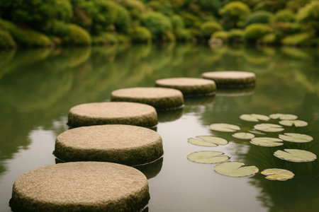 Serene Stepping Stones Pathway Through Calm Water in a Zen Garden Setting for Tranquil Meditation