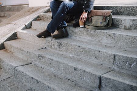 Close-up of a man's feet on the stairs of a building