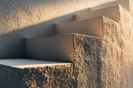 A sleek concrete staircase bathed in gentle sunlight, creating subtle shadows on gritty walls within a minimalist architectural space.
