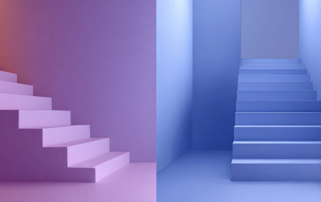 Two sets of stairs ascend within different colored environments, purple and blue. The composition highlights geometric forms with hard lighting. This visual could represent decisions, progress, or opposing concepts. Suitable for editorial illustrations, graphic design, and concepts of choice and paths.