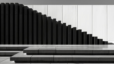 This high-contrast image features a modern black staircase against a stark white background, exemplifying minimalist architectural design and clean lines.
