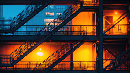 This captivating image features an urban staircase illuminated by warm lighting, highlighting architectural details and modern design elements in a cityscape.