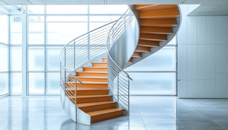 A crafted spiral staircase with wooden steps and a stylish metal railing in a spacious room with many windows