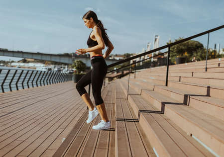 Determined Young Woman Climbing Up Stairs with Blue Sky, Concept of Business Career Rise