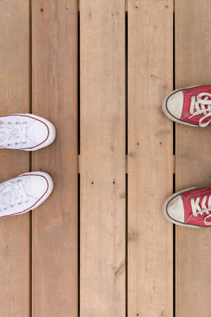 Top view on peoples feet in white and red sneakers standing on wooden floor or bridge.