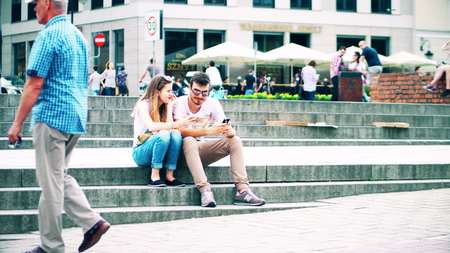 WARSAW, POLAND - JUNE 10, 2017. Young couple sit on the street and use their cellphones
