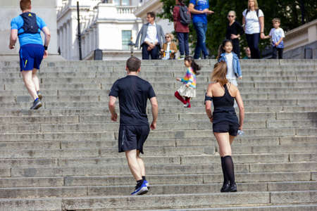 London / England - May 26 2019: A portrait of a male and a female runner, running up the stairs downtown London during the vitality London 10k run.