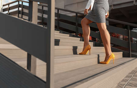 Closeup woman's feet in white sneakers walking up on the stair outside the building, step by step level concept