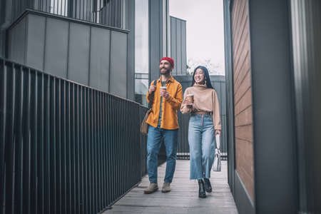 The feet of two people stand on the steps of the stairs, stylish new sneakers, modern shoes, casual style in clothes, bare ankles, white sneakers, blue jeans.