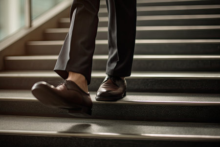 Close-up of a mans polished brown formal shoes ascending a flight of concrete steps, symbolizing progress and determination