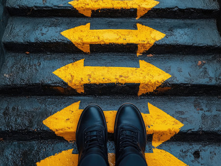 A person standing at the top of stairs, with an arrow pointing upwards and showing progress or success. The yellow arrow is placed on each step leading to the one above it, symbolizing growth or new beginnings. A pair of black shoes stands next to them, adding depth and realism to the scene. This visual metaphor represents personal development in life's journey towards a silhouette of a woman walking up steps. --ar 4:3 --stylize 750 --v 6.1 Job ID: 3c6c5bb7-d5e8-478c-8b10-cda7a7399e75
