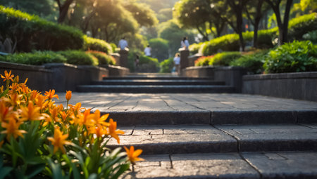 Discover a tranquil garden pathway featuring hexagonal stone steps, framed by lush greenery and vivid red flowers, creating a serene outdoor ambiance.