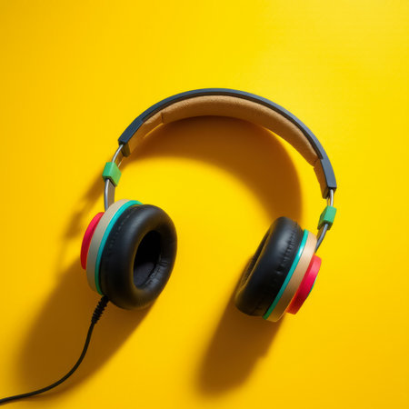 Stylish black wireless headphones on a bright yellow background, perfect for showcasing modern technology and audio equipment for lifestyle and music visuals.