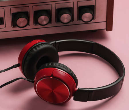 Old-fashioned vinyl player, headphones on pink pastel background. Media 70s.