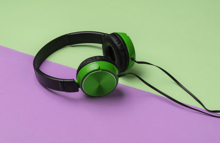 Modern wired headphones on pink green pastel background. Music lover concept.