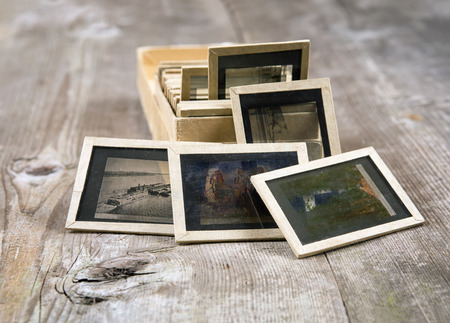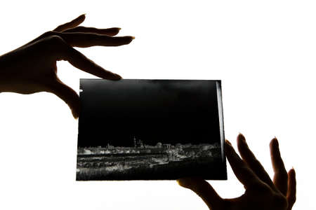 Beautiful female fingers hold a glass negative. On the negative is depicted the area of Michali. Suzdal.
