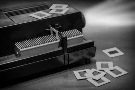 Outdated stereoscope with a stereo diapositiv cards. 3D viewing device. Children toy