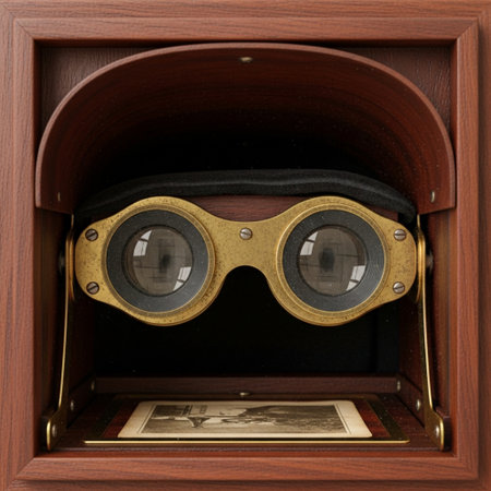 A hero detail shot focusing on the optical mechanism of a vintage stereoscope. The composition is a