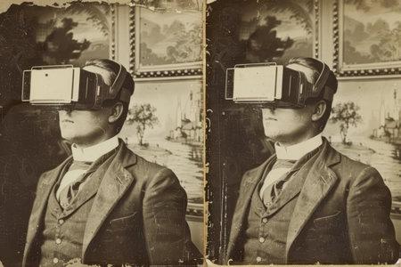 A man is immersed in an early form of virtual reality, wearing a large headset. He is dressed in formal vintage clothing, capturing a moment from the past. The background reveals a decorated interior, enhancing the historical context of this intriguing technological experience.