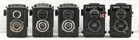 MOSCOW, RUSSIA, MARCH 30, 2019. The old Soviet medium format film TLR cameras Lubitel and Komsomolets released on GOMZ from 1946 to 1990 on white cement background. Amateur.