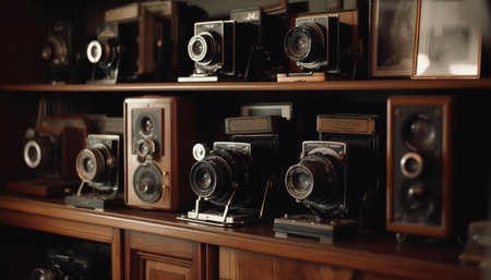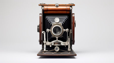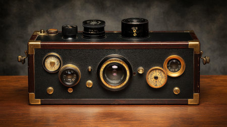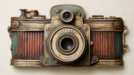 An antique camera on a wooden table, a nostalgic still life generated by artificial intelligence
