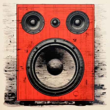 the red speaker in this photo is a 2d artwork created in the style of a woodcut. it features rustic textures and was inspired by the artist martin ansin. the dynamic urban abstraction is depicted through a lithograph, showcasing symmetry. brian mashburn's influence can also be seen in this captivating piece. ai generated