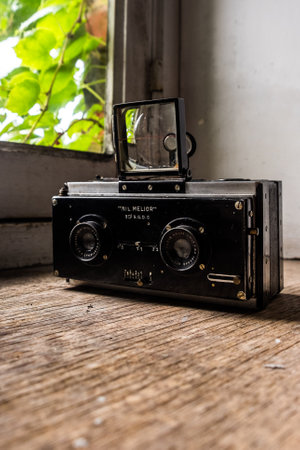 Close-up of a retro twin-lens camera with visible wear and tear, standing on a weathered table, showcasing its antique charm, softly lit background