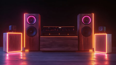 Explore a modern sound system featuring unique wooden speakers with vibrant LED lights, perfect for enhancing audio experiences in any space.