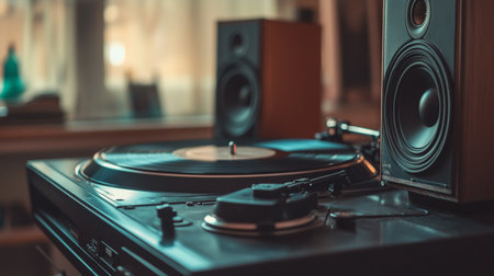A vintage turntable with large speakers, showcasing an old-school audio setup - ai