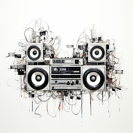 A striking composition showcases a towering arrangement of sound speakers illuminated by vibrant neon lights. The image displays a variety of shapes and sizes with distinct circular openings, enhancing visual interest. The artwork is suitable for entertainment, music-related projects, and promotional materials in the creative industry.