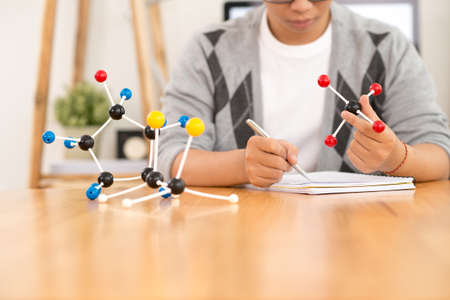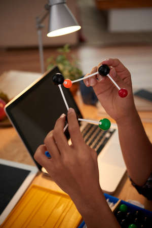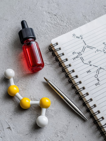 Molecular model in yellow and white with a red dropper bottle and notebook filled with chemical structures present during an evening study session.