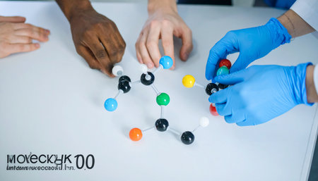 A diverse team of students collaborates in a science class, their hands working together to build a complex molecular model.