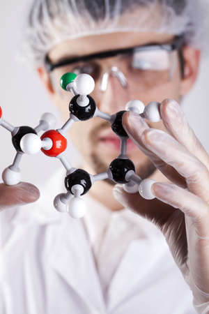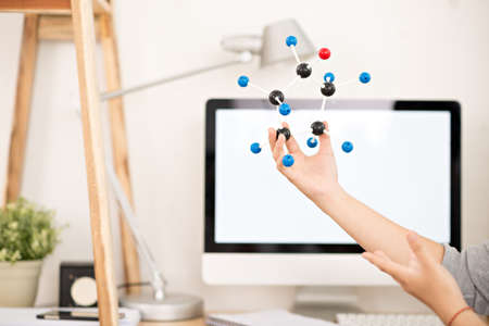 Contemporary research. Innovation concept. Molecule model in the hands of the teacher. A scientist, in a white coat, holds a flask and a model of a molecule in his hands. Flask with substance. Atomic
