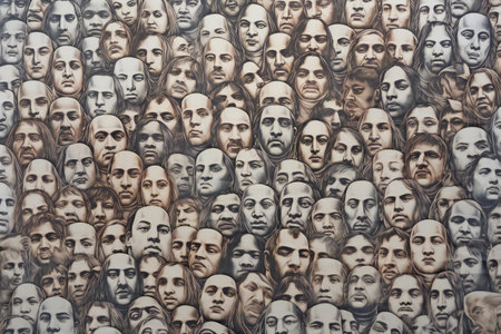 Group of women's faces on the wall. Selective focus.