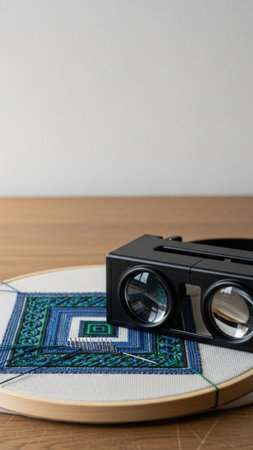 A vertical, tall composition (9:16) still life featuring a precision textile craft project--a micro-w