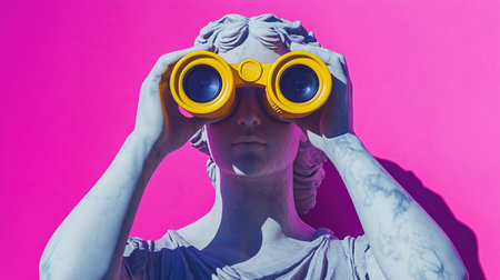 Against a vivid pink backdrop, a marble figure of an antique Greek goddess holds yellow plastic binoculars in both hands. The use of shadows creates a contemporary, fantastical aesthetic
