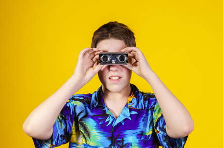 Teenage boy with opera binocular close-up portrait isolated on yellow background