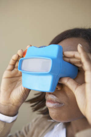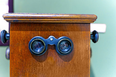 Outdated stereoscope with a stereo diapositiv cards. 3D viewing device. Children toy