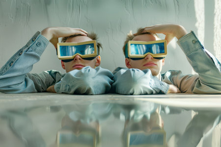 Two people are lying on a reflective surface in a serene, minimalist room. They are wearing retro-style futuristic glasses that emphasize their tranquil expressions. Soft natural light fills the space, creating a calm atmosphere.