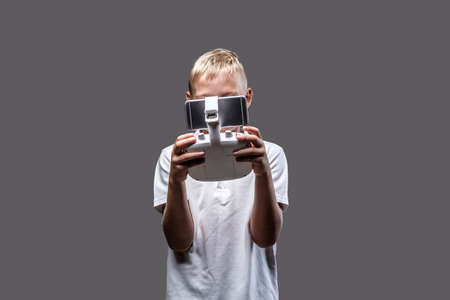 Handsome little boy boxer with blonde hair dressed in a white t-shirt holds a quadcopter control remote. Isolated on a gray background.