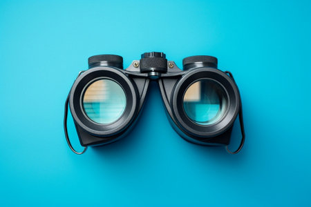 close-up detail of a binoculars glass, on a blue background. concept of travel, search and sighting of birds. small black binoculars for children. space for copying text.
