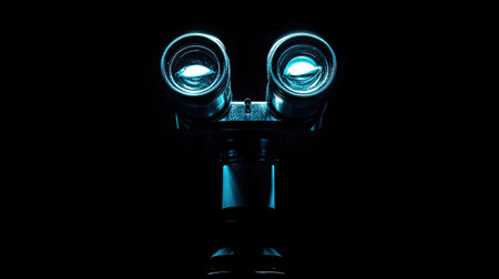 Binoculars reflecting cityscape at night representing concept of vision and exploration