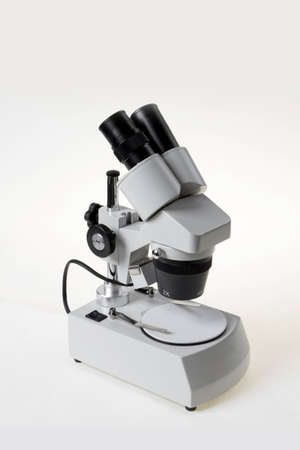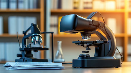 Laboratory equipment optical microscope, closeup of scientific microscope with metal lens, data analysis in the laboratory
