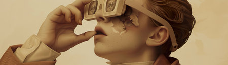 A man looking through binoculars made of vintage film. Two hands hold a twisted photographic film in front of his eyes. A close-up. Selective focus.