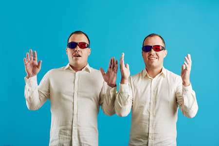 Caucasian twin brothers wearing white shirts and anaglyph 3D glasses looking at camera, bright blue background