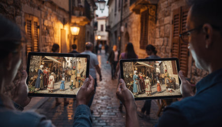 Visitors walk through an old town alley tablets revealing augmented reality street life from centuries past sharply capturing historical figures as the cobbled street fades out of