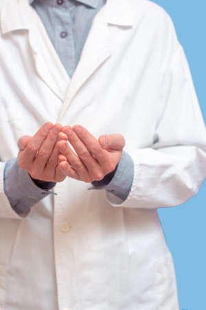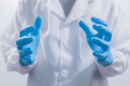 medic in white coat, wearing in blue sterile gloves, showing hand gesture indicating the subject, blue background